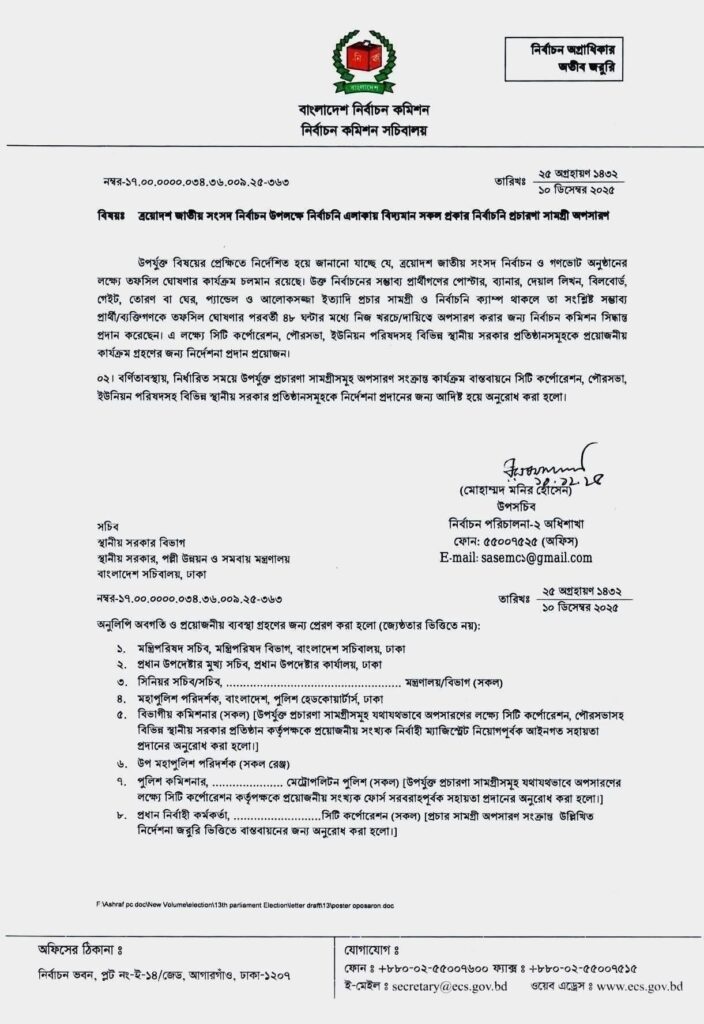 এদিকে, ত্রয়োদশ জাতীয় সংসদ নির্বাচন ও একই সঙ্গে অনুষ্ঠিতব্য জুলাই গণভোট অবাধ, সুষ্ঠু ও নিরপেক্ষভাবে নিশ্চিত করতে নির্বাচন কমিশন সচিবালয় (ইসি) নির্বাচনি এলাকার সরকারি সম্পত্তি ব্যবহার সংক্রান্ত একটি কঠোর নির্দেশনা জারি করেছে। নির্বাচন কমিশন সচিবালয়ের উপসচিব (নির্বাচন পরিচালনা-২) মোহাম্মদ মনির হোসেন স্বাক্ষরিত বিজ্ঞপ্তিতে বলা হয়েছে, তফসিল ঘোষণার পর থেকে সংশ্লিষ্ট এলাকার যেকোনো ধরনের সরকারি, আধা-সরকারি, স্বায়ত্তশাসিত বা বেসরকারি প্রতিষ্ঠানের ভবনের সম্পত্তি বা স্থান অস্থায়ী ক্যাম্প, গাড়ির গ্যারেজ, গোডাউন, বিশ্রামাগার বা নির্বাচনি সামগ্রী রাখার জন্য ব্যবহার করা যাবে না।